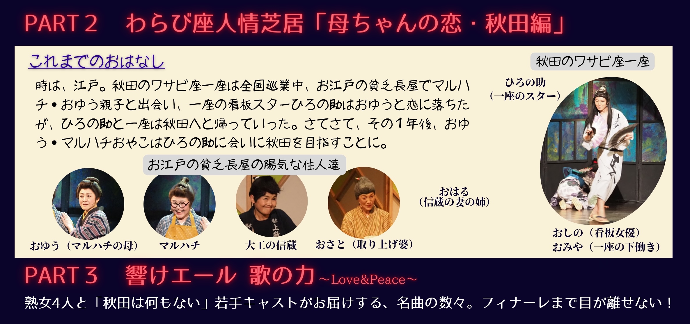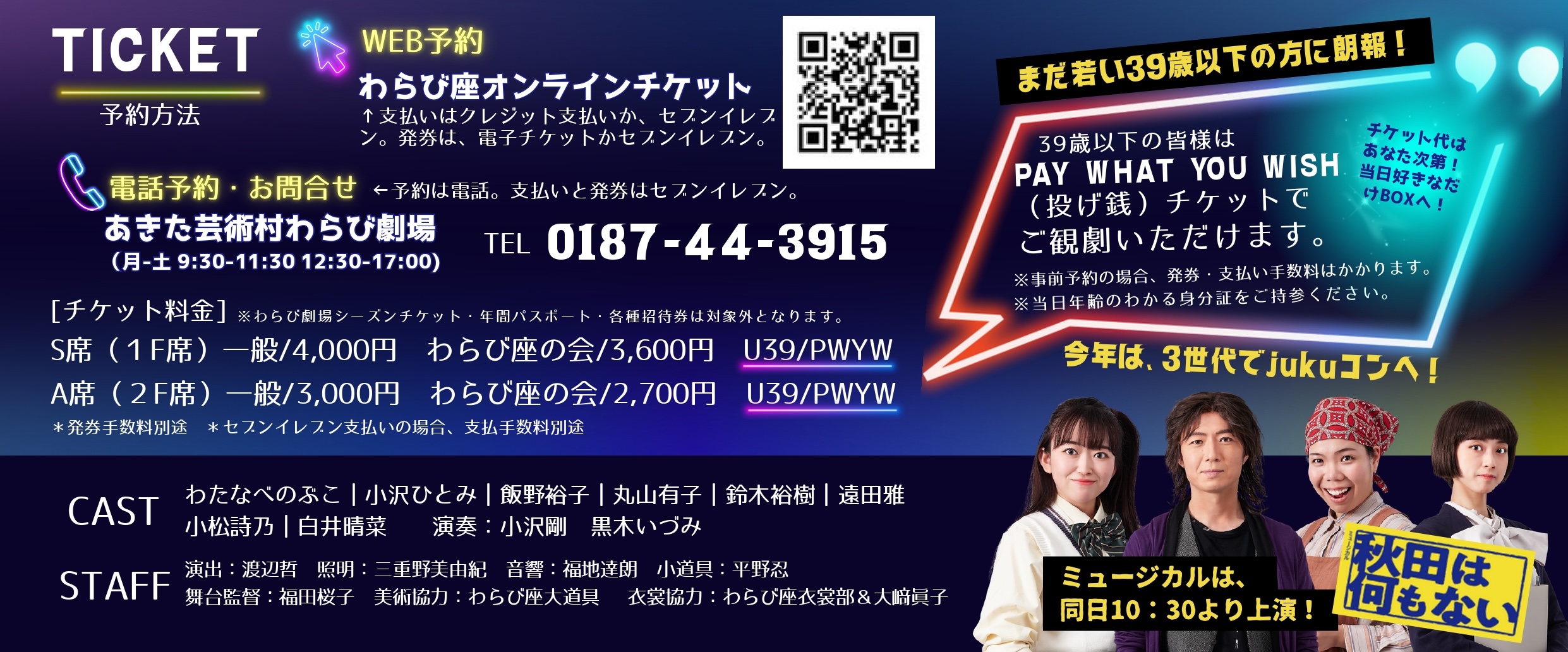 今年で4回目の開催となる、JUKUJOコンサート。今年も、わたなべのぶこ・小沢ひとみ・飯野裕子・丸山有子の4人が立ち上がります・・・!「秋田は何もない」出演中のメンバーも出演!ぜひミュージカルと合わせてお楽しみください。