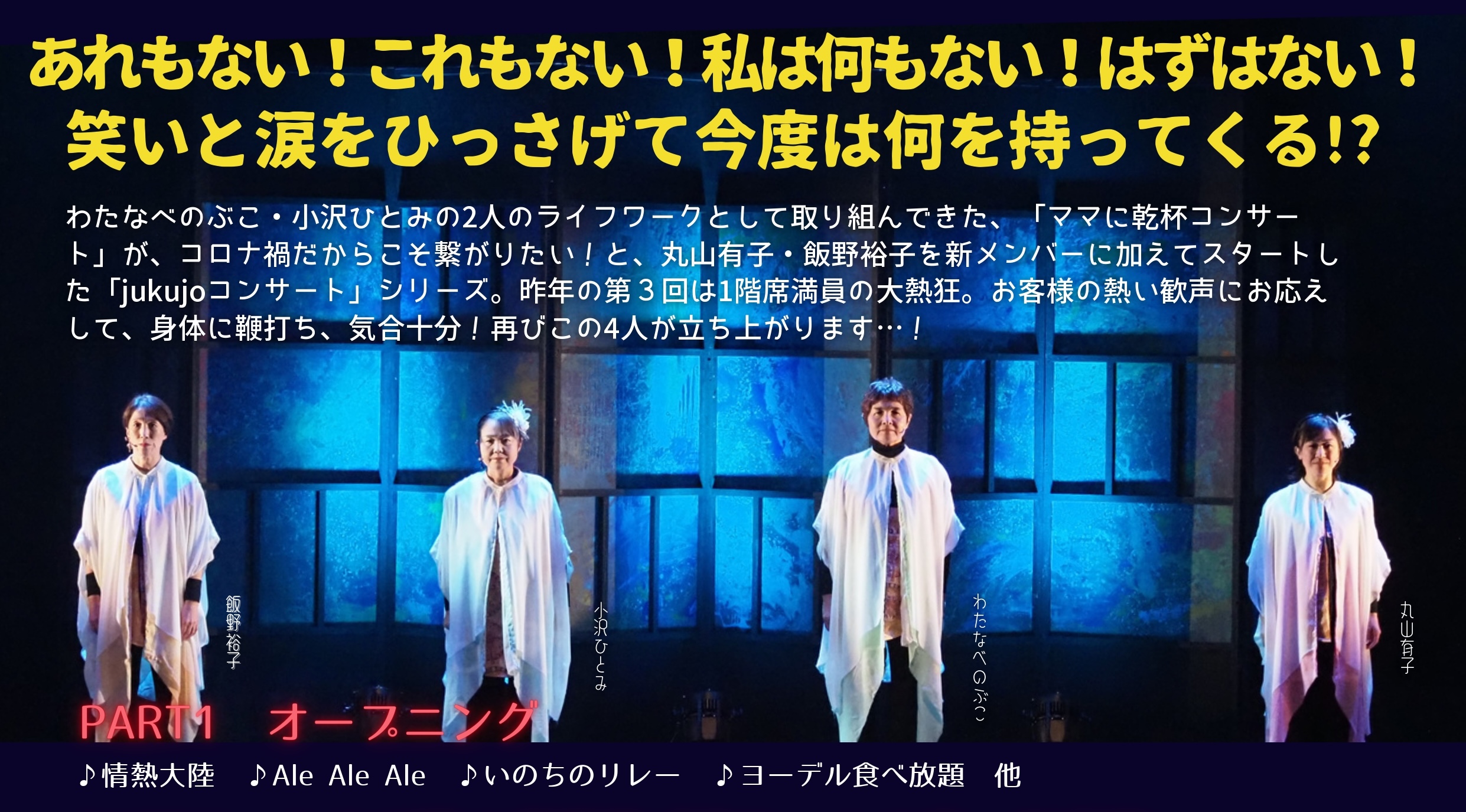 今年で4回目の開催となる、JUKUJOコンサート。今年も、わたなべのぶこ・小沢ひとみ・飯野裕子・丸山有子の4人が立ち上がります・・・!「秋田は何もない」出演中のメンバーも出演!ぜひミュージカルと合わせてお楽しみください。